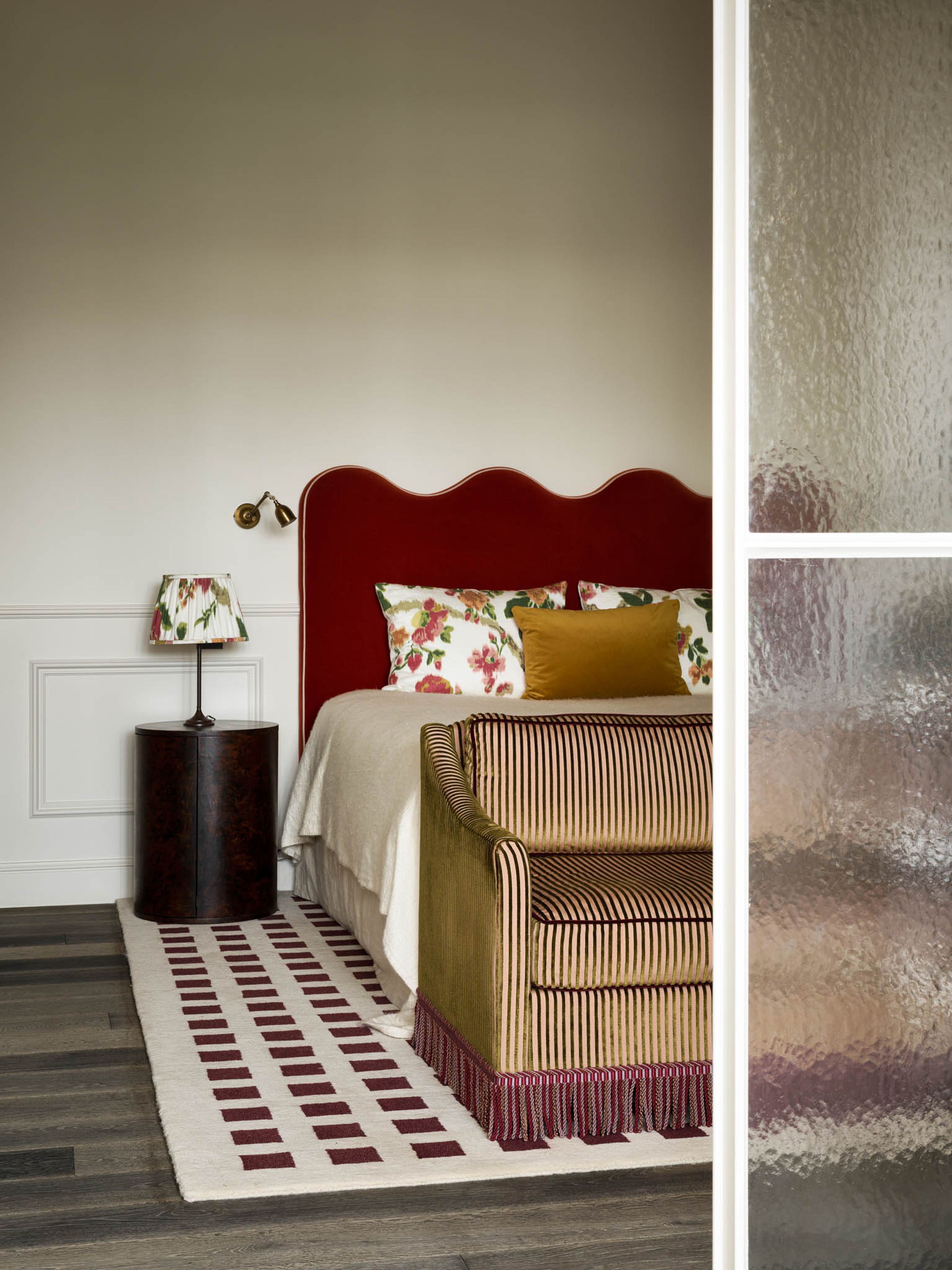 With its soft, luxurious presence, the headboard brings calm and cohesion to the room, forming a strong foundation for layered styling with art, textiles, and carefully selected vintage accents.
